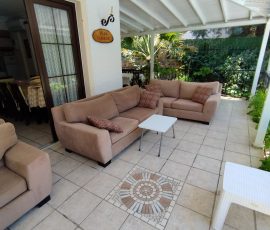 Step inside to find a beautifully designed interior where a grand marble staircase leads you to four spacious, fully air-conditioned bedrooms. The heart of the outdoor living area is a large, covered balcony—perfectly equipped for al fresco dining while providing a cool retreat from the Mediterranean sun.